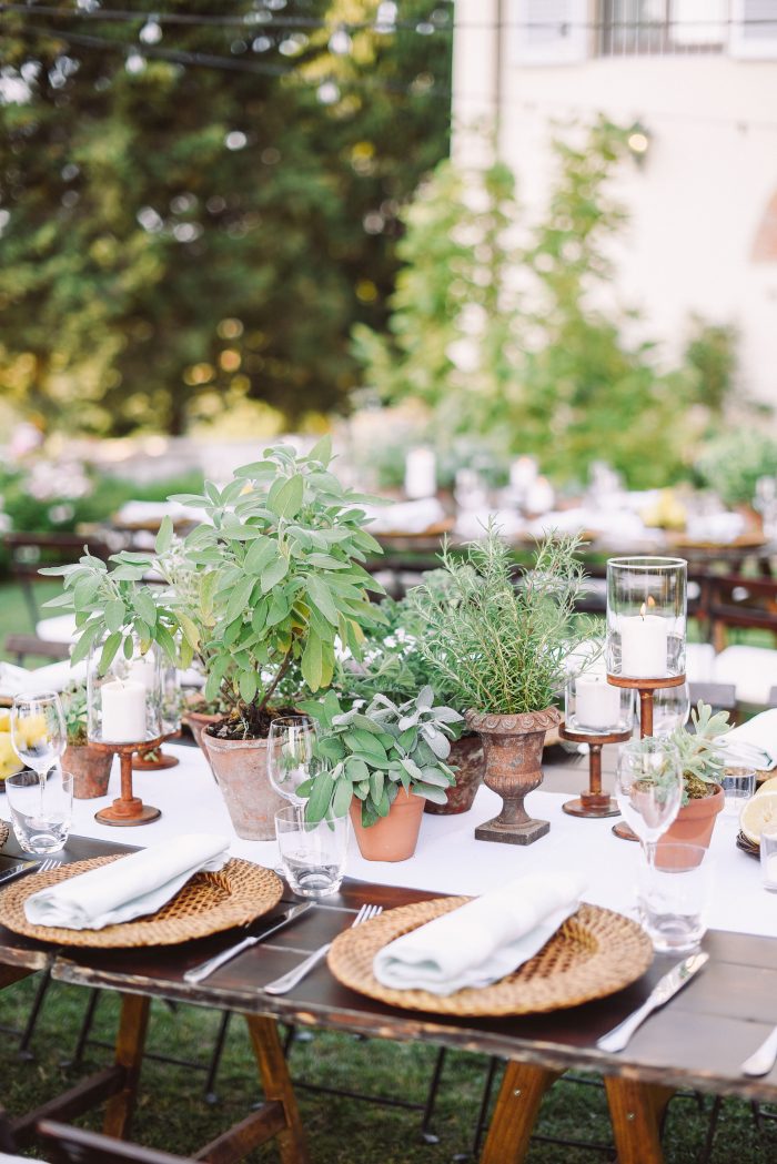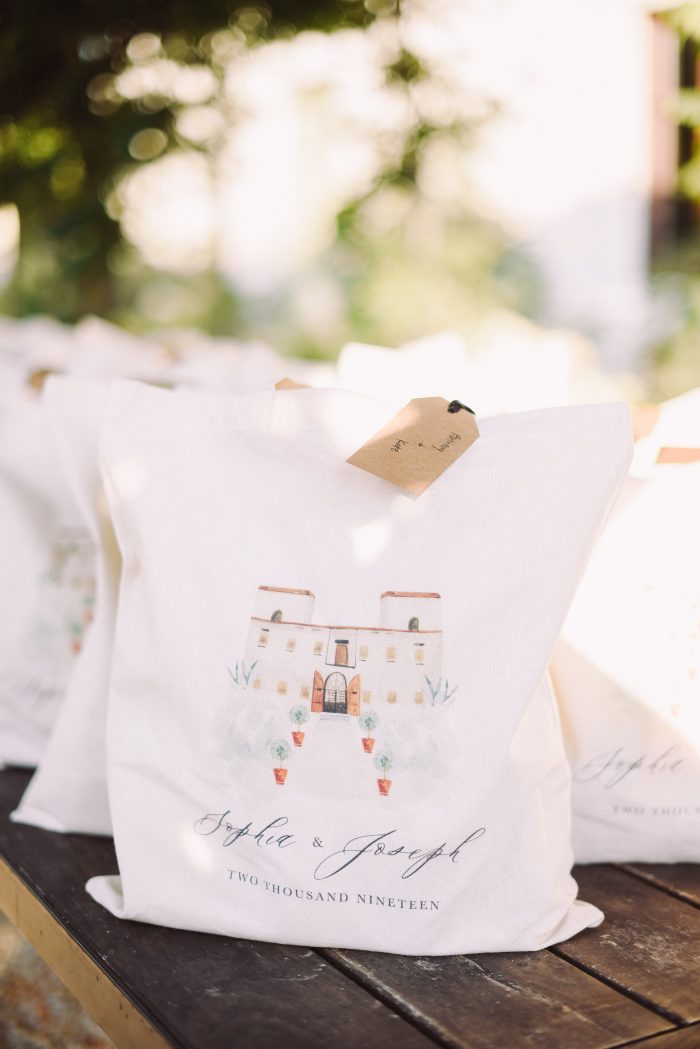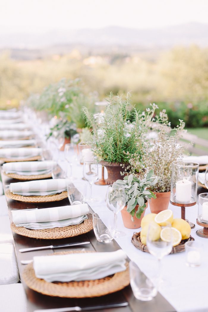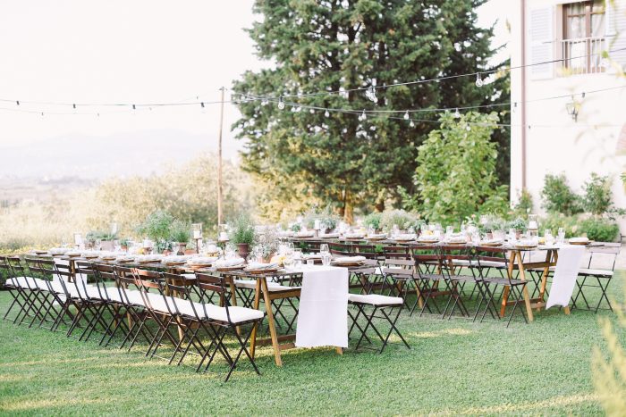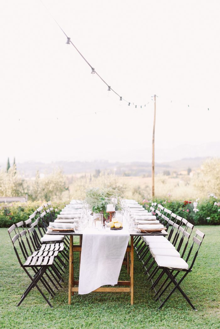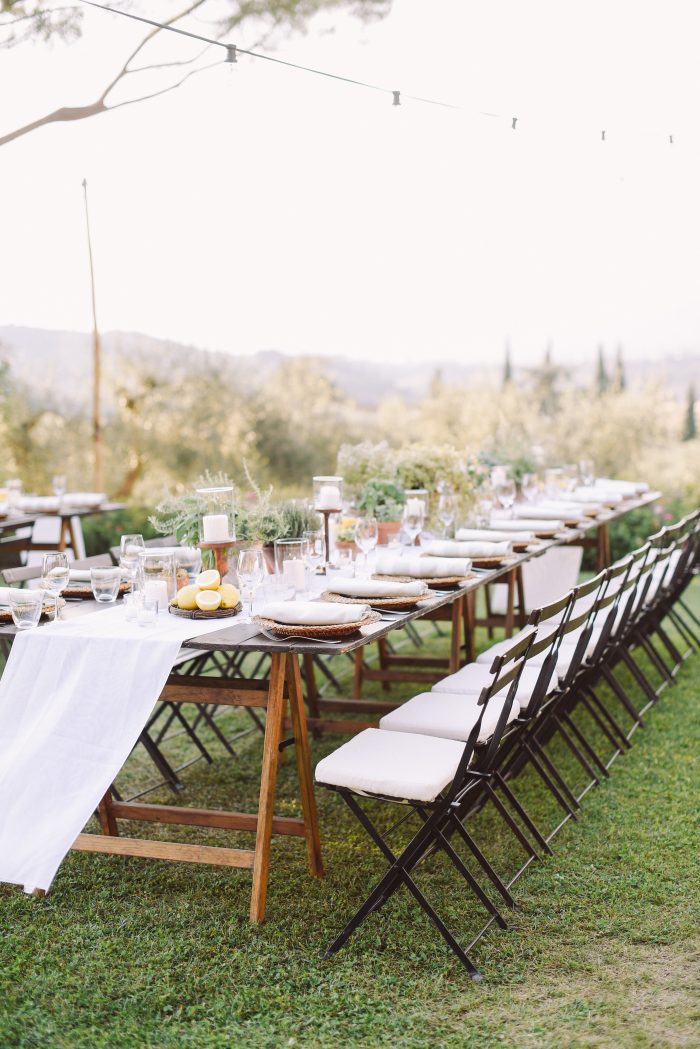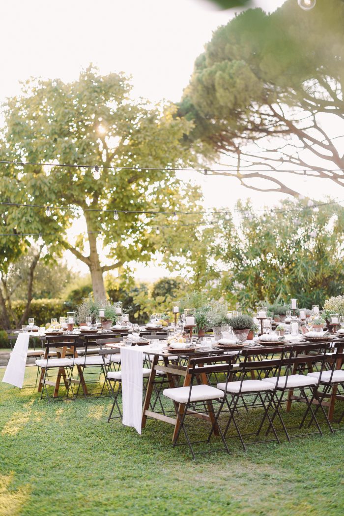 For them, we planned and designed a 2-day event including a rehearsal dinner at a nearby villa. We offered them a typical Tuscan pizza night under string lights and a fantastic ice cream cart as dessert. The design included custom totebags for the guests with a venue watercolor enclosing a bottle of red wine from the Villa. We choose long wooden tables with lemons and aromatic plants in pots and white and sage napkins. The day after, the wedding dinner took place in the lemon grove of the villa under a fairy light ceiling. We upgraded the design to a black-tie look by incorporating touches of black to contrast with the white and green florals and gold Chiavari chairs.